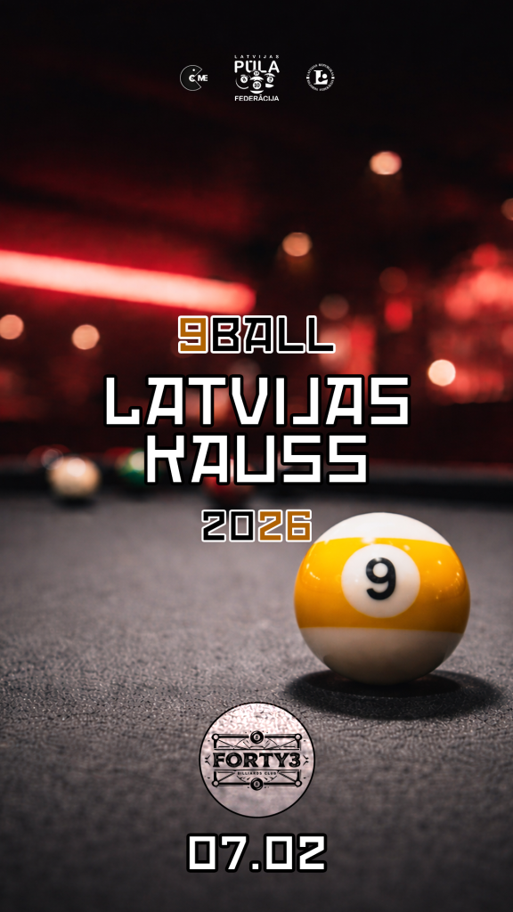 Latvijas Kausa posms POOL9 pirmo reizi notiks biljarda klubā “Forty3” (Barona iela 41/43, trešais stāvs), š.g. 7.februārī. Klubs atveras 08:00, reģistrācija līdz 08:45, spēļu sākums 09:00. Dalības maksa 30EUR (līdz 18 gadiem 15EUR).